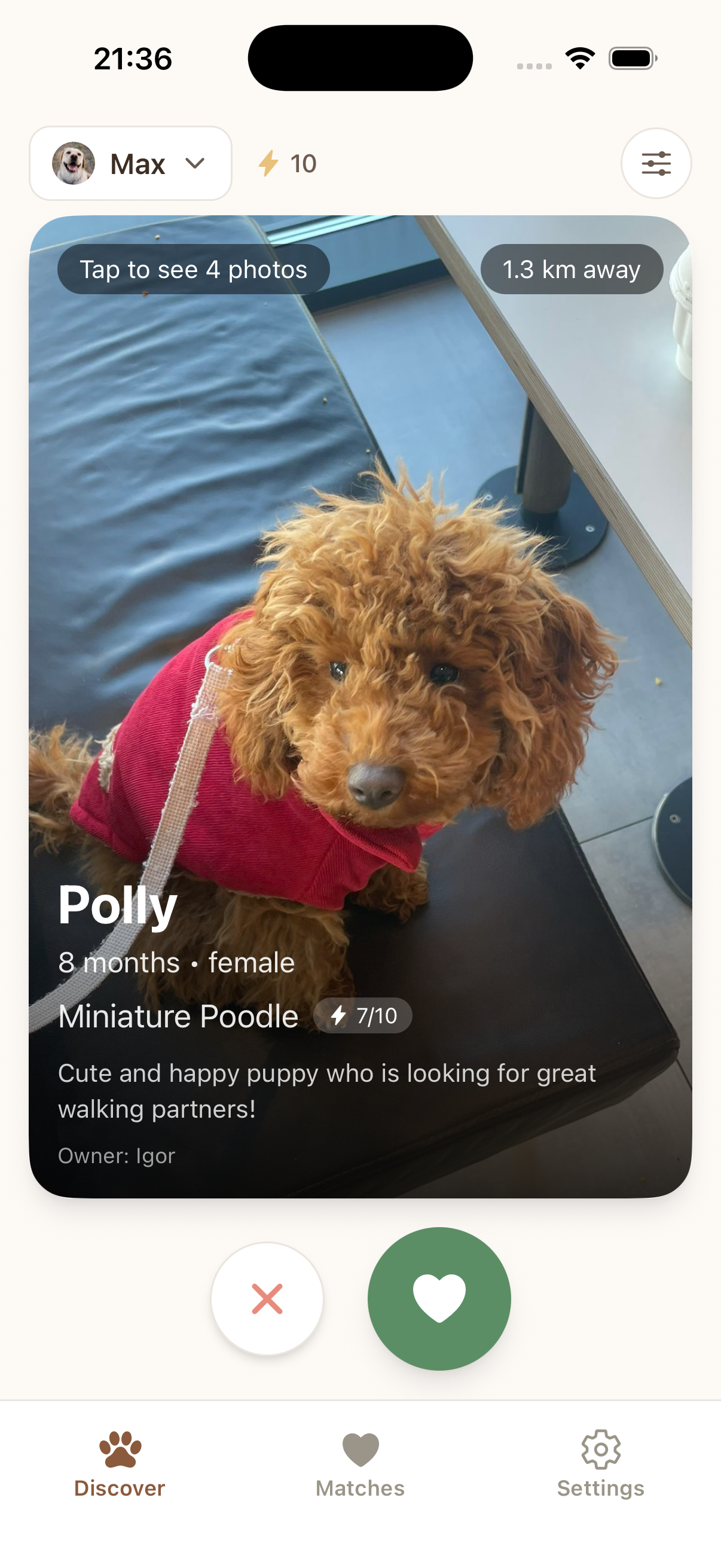 Find the perfect playmate with powerful filters. Search by size, breed, age range, energy level, and radius. Free includes 10 km and 15 km, while Pro unlocks up to 200 km.