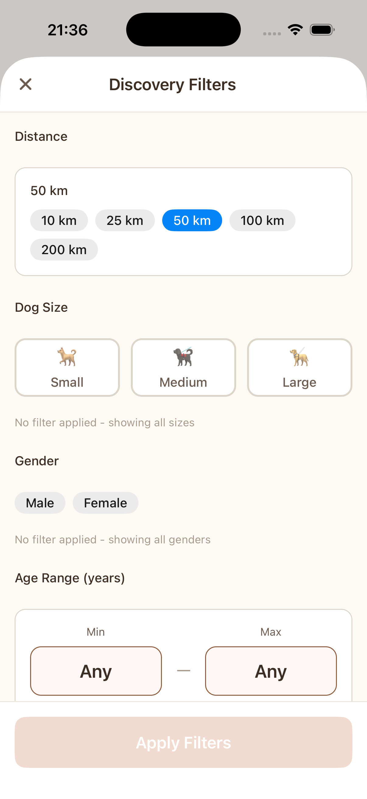 You can filter potential matches by size, breed, age range (min/max), gender, energy level, and location radius. Free users can choose 10 km or 15 km, while Pro users can expand radius up to 200 km.