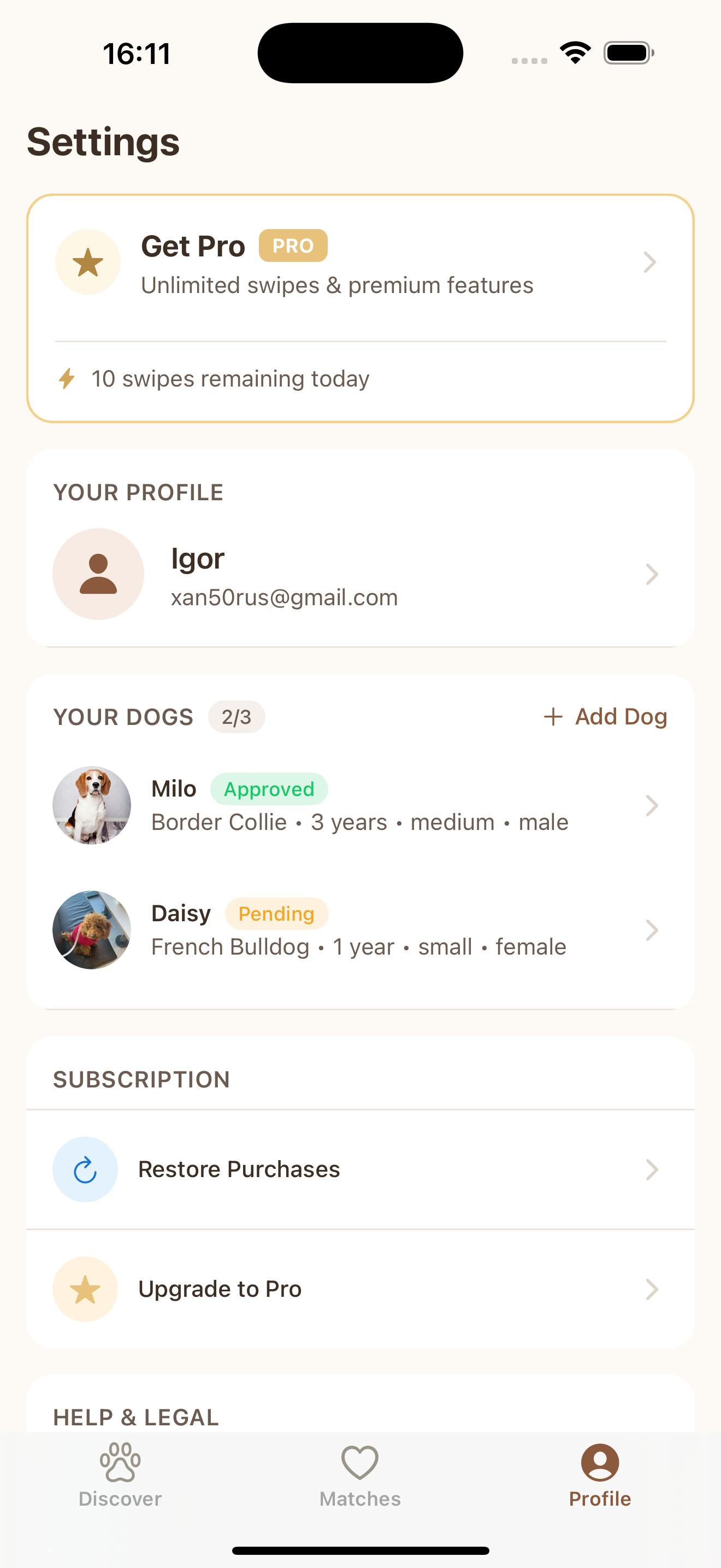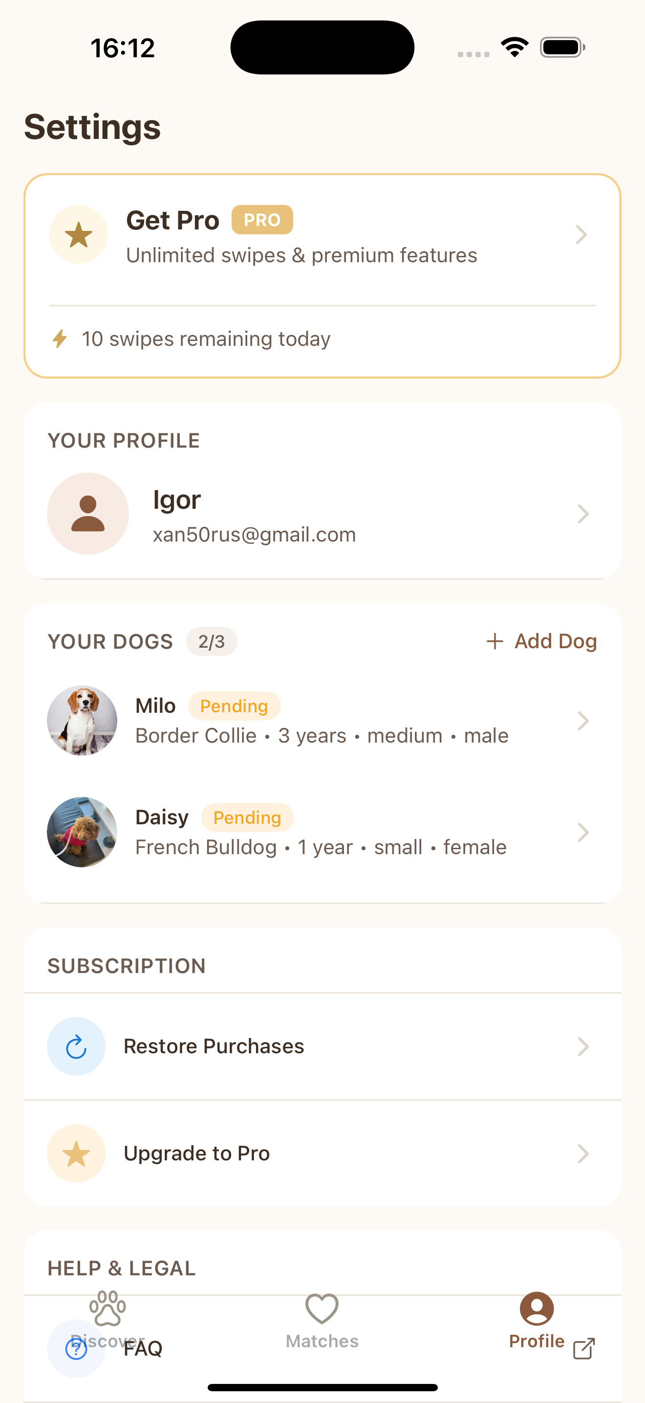 Yes. You can manage multiple dogs in one account: up to 3 dogs on the free plan and up to 6 dogs on Pro. Each dog has its own profile, photos, preferences, and matches, and you can switch between them anytime.